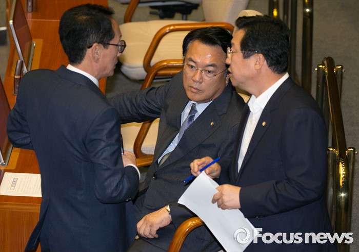 (서울=포커스뉴스) 5일 오후 서울 여의도 국회에서 열린 343회 국회(임시회) 7차 본회의, 정치·외교·통일·안보·교육·사회·문화에 관한 질문에 참석한 정진석(가운데) 새누리당 원내대표, 김도읍(왼쪽) 원내수석부대표, 이장우 의원이 대화하고 있다. 이날 대정부 질문은 이장우 새누리당 의원 등과 김동철 국민의당 의원의 언쟁으로 오전 회의가 정회됐었다.
