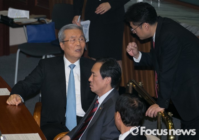 (서울=포커스뉴스) 5일 오후 서울 여의도 국회에서 열린 343회 국회(임시회) 7차 본회의, 정치·외교·통일·안보·교육·사회·문화에 관한 질문에 참석한 김종인 더불어민주당 비대위 대표와 홍익표 의원 등이 대화하고 있다.