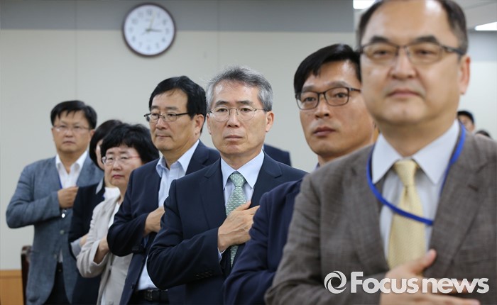(세종=포커스뉴스) 5일 세종시 정부세종청사 고용노동부 최저임금위원회에서 열린 제9차 전원회에서 박준성 위원장과 위원들이 국기에 대한 경례를 하고 있다.