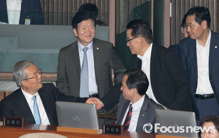 (서울=포커스뉴스) 5일 오후 서울 여의도 국회에서 열린 343회 국회(임시회) 7차 본회의, 정치·외교·통일·안보·교육·사회·문화에 관한 질문에 참석한 김종인 더불어민주당 비대위 대표, 우상호 원내대표와 박지원 국민의당 비대위원장, 김관영 원내수석부대표 등이 대화하고 있다.