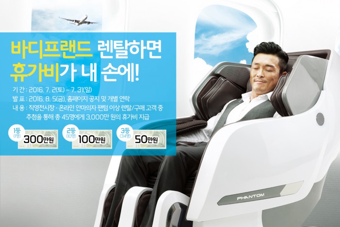 (서울=포커스뉴스) 헬스케어 그룹 바디프랜드는 여름 휴가 시즌을 앞두고 총 3000만원의 휴가비를 지원하는 '바디프랜드 렌탈하면, 휴가비가 내 손에!' 이벤트를 진행한다고 5일 밝혔다.