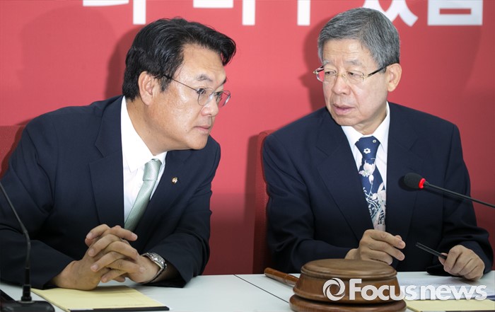 (서울=포커스뉴스) 6일 오전 서울 여의도 국회에서 열린 새누리당 혁신비상대책위원회의에 참석한 김희옥(오른쪽) 위원장과 정진석 원내대표가 대화하고 있다.