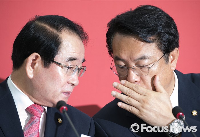 (서울=포커스뉴스) 6일 오전 서울 여의도 국회에서 열린 새누리당 혁신비상대책위원회의에 참석한 정진석(오른쪽) 원내대표와 박명재 사무총장이 대화하고 있다.