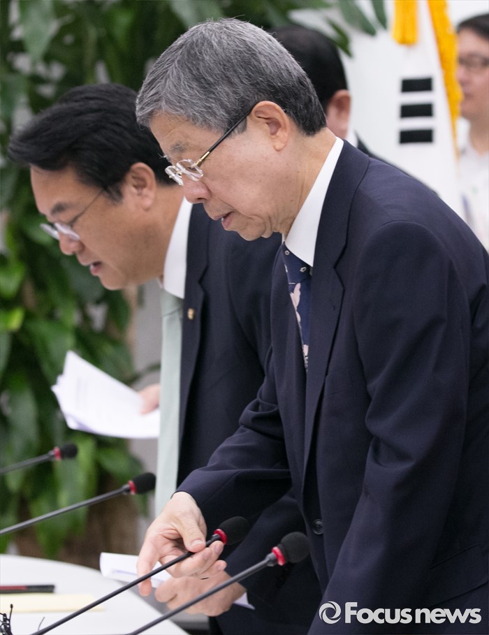 (서울=포커스뉴스) 6일 오전 서울 여의도 국회에서 열린 새누리당 혁신비상대책위원회의에 김희옥 위원장과 정진석 원내대표가 참석하고 있다.
