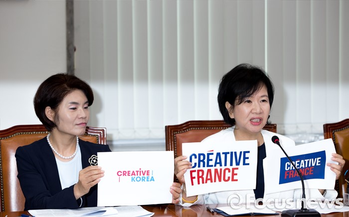 (서울=포커스뉴스) 손혜원 더불어민주당 의원이 6일 오전 서울 여의도 국회에서 열린 비상대책위원회의에 참석해 대한민국의 새 국가브랜드로 지정된 '크리에이티브 코리아(CREATIVE KOREA)'가 프랑스 무역투자진흥청 비즈니스 프랑스가 선정한 '크리에이티브 프랑스' 캠페인을 표절했다고 밝히고 있다.