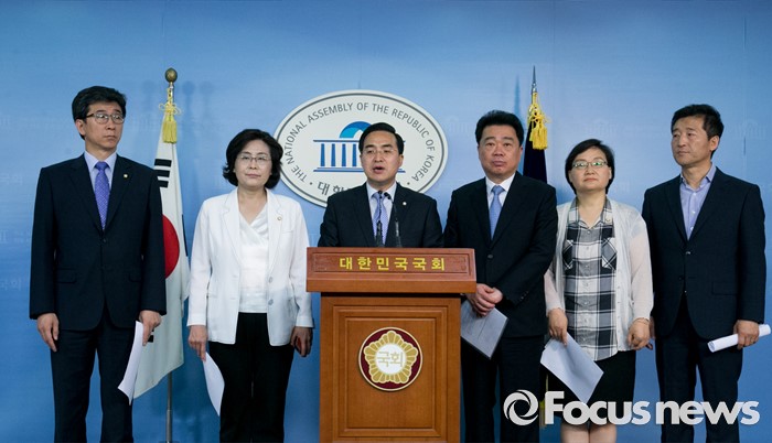 (서울=포커스뉴스) 6일 오전 서울 여의도 국회 정론관에서 미래창조과학방송통신위원회 소속 더불어민주당 의원들이 이정현 전 청와대 홍보수석과 김시곤 전 KBS 보도국장의 세월호 참사 보도통제 논란과 관련 새누리당과 박근혜 정부의 진상규명 협조 촉구 기자회견을 하고 있다.