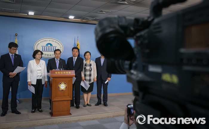 (서울=포커스뉴스) 6일 오전 서울 여의도 국회 정론관에서 미래창조과학방송통신위원회 소속 더불어민주당 의원들이 이정현 전 청와대 홍보수석과 김시곤 전 KBS 보도국장의 세월호 참사 보도통제 논란과 관련 새누리당과 박근혜 정부의 진상규명 협조 촉구 기자회견을 하고 있다.