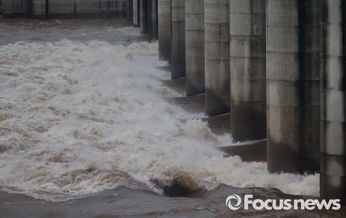 (연천=포커스뉴스) 북한이 황강댐을 방류한 6일 오전 경기도 연천군 군남홍수조절지에서 한국수자원공사가 수위조절을 위해 임진강 강물을 방류하고 있다.