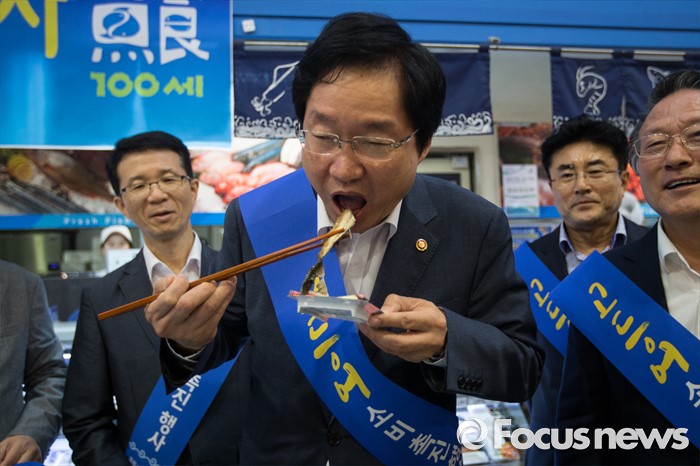 | △ 눈 질끈 감고, 고등어 먹는 해수부 장관 |