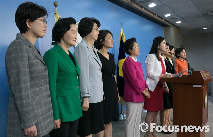 (서울=포커스뉴스) 6일 오전 서울 여의도 국회 정론관에서 새누리당 여성 의원들이 표창원 더불어민주당 의원의 대정부 질문 중 학교전담경찰관 발언 논란과 관련 사과 촉구 기자회견을 하고 있다. 왼쪽부터 최연혜, 윤종필, 김승희, 전희경, 이은재, 신보라, 김순례, 송희경, 김정재 의원.