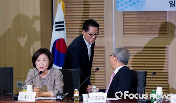 (서울=포커스뉴스) 김종인(오른쪽) 더불어민주당 비상대책위 대표와 박지원(가운데) 국민의당 비상대책위원장이 6일 오전 서울 여의도 국회의원회관에서 열린 '따뜻한 미래를 위한 정치기획 창립기념 특강'에 참석해 악수 하고 있다.