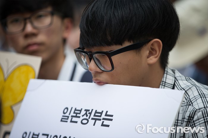 (서울=포커스뉴스) 6일 오후 서울 종로구 주한일본대사관 앞에서 열린 일본군 '위안부' 문제 해결을 위한 제1238차 정기 수요집회에서 한 학생이 한일합의를 반대하는 피켓을 들고 있다.