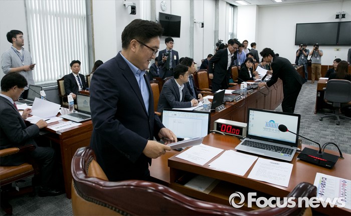 (서울=포커스뉴스) 6일 오후 서울 여의도 국회에서 열린 가습기살균제 사고 진상규명과 피해구제 및 재발방지 대책마련을 위한 국정조사특별위원회 전체회의에 참석한 우원식 더불어민주당 의원이 위원장으로 선임된 뒤 자리로 향하고 있다.