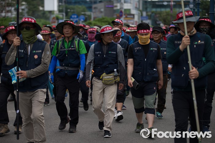 (서울=포커스뉴스) 전국건설노동조합 조합원들이 6일 오후 서울역광장에서 총파업 집회에 앞서 건설사 직접 시공제 도입 등 18대 대정부 요구안 제시를 촉구하며 가두행진을 하고 있다.