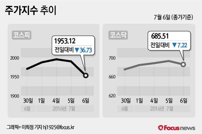 (서울=포커스뉴스) 6일 코스피지수는 전날보다 1.85%(36.73포인트) 내린 1953.12에 장을 마쳤다. 코스닥지수는 전일 대비 1.04%(7.22포인트) 내린 685.51에 마감했다.