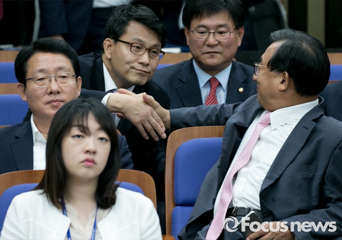 (서울=포커스뉴스) 6일 오후 서울 여의도 국회에서 열린 새누리당 의원총회에 참석한 윤상현(왼쪽), 이정현 의원이 악수하고 있다.