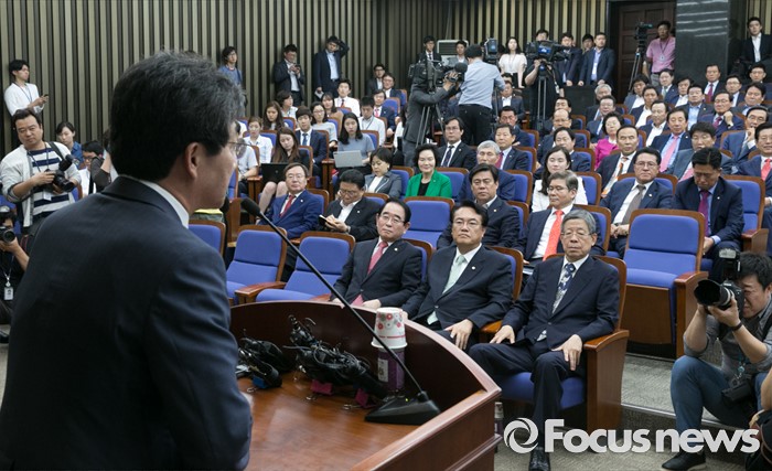 | △ 유승민 복당 인사말 듣는 새누리당 의원들 |
