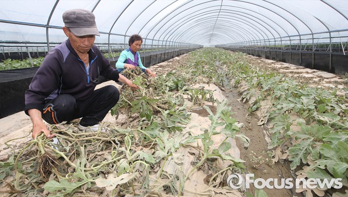 (부여=포커스뉴스) 6일 오후 집중호우로 수해를 입은 충남 부여 정동리 수박 비닐하우스에서 농민이 피해를 입은 농작물을 거두고 있다. 이날 이동필 농림축산식품부 장관은 농작물 수해지역과 농민의 애로사항을 점검했다.