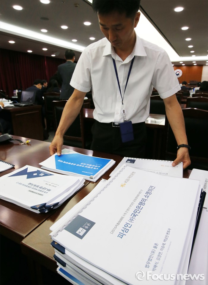 (세종=포커스뉴스) 지난달 22일 세종시 정부세종청사 공정거래위원회 심판정에서 열린 6개 시중은행(국민·농협·신한·우리·하나·SC은행)의 양도성예금증서(CD)금리 담합의혹에 대한 심의에 앞서 공정위 직원들이 관련 자료를 정리하고 있다. 6일 공정위 전원회의는 CD금리 담합과 관련해 법 위반 여부를 결정하기 어렵다고 판단, 심의절차를 종료 한다고 밝혔다.