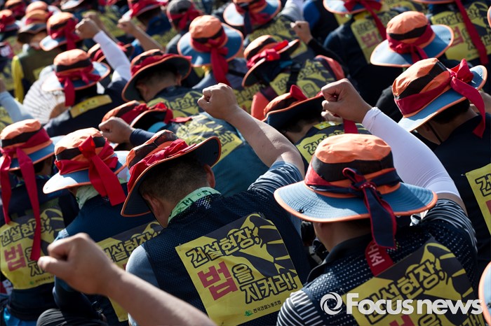 (서울=포커스뉴스) 6일 오후 서울 중구 서울시청광장에서 열린 '건설노동자 총력투쟁 결의대회'에 참석한 조합원들이 안전한 건설현장을 촉구하며 구호를 외치고 있다.