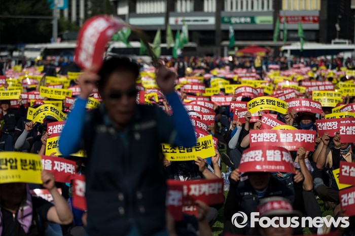 (서울=포커스뉴스) 6일 오후 서울 중구 서울시청광장에서 전국에서 모인 건설노조원들이 '건설노동자 총력투쟁 결의대회'에 참가하고 있다.