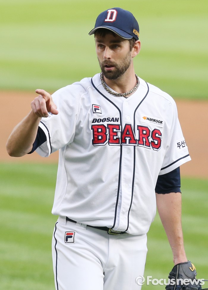 (서울=포커스뉴스) 6일 서울 잠실구장에서 열린 2016 프로야구 넥센-두산 경기에서 두산 선발투수 니퍼트가 1회초 수비를 3자 범퇴 처리하고 덕아웃으로 들어가며 포수 양의지에게 격려의 손짓을 하고 있다.