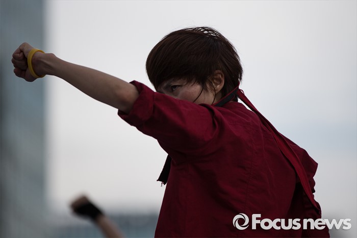 (서울=포커스뉴스) 6일 오후 서울 중구 서울시청광장에서 열린 '건설노동자 총력투쟁 결의대회'에 참석한 조합원들이 안전한 건설현장을 촉구하며 공연을 펼치고 있다.