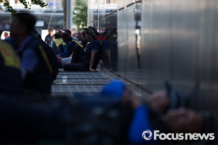 (서울=포커스뉴스) 6일 오후 서울 중구 서울시청광장에서 열린 '건설노동자 총력투쟁 결의대회'에 참석한 조합원들이 광장 인근에서 휴식을 취하고 있다.