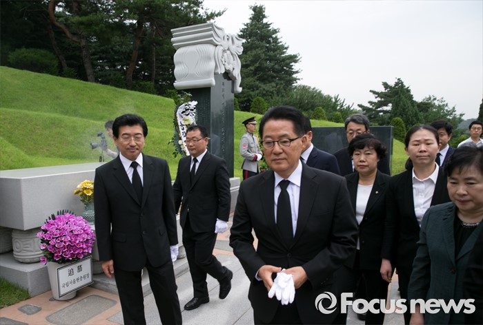 (서울=포커스뉴스) 박지원 국민의당 비상대책위원장과 비대위원 등이 7일 오전 동작구 국립서울현충원을 방문해 故 김대중 전 대통령 묘소 참배를 마친 뒤 나서고 있다.