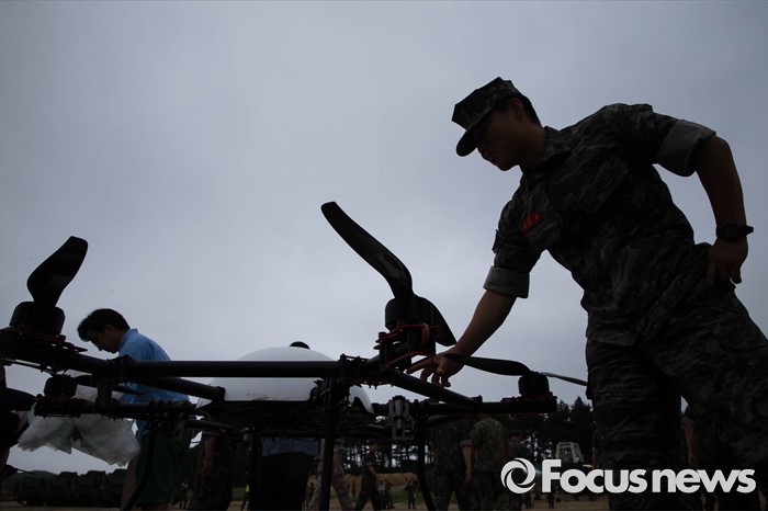 | △ 군수품 수송용 드론 살펴보는 해병대 대원 |