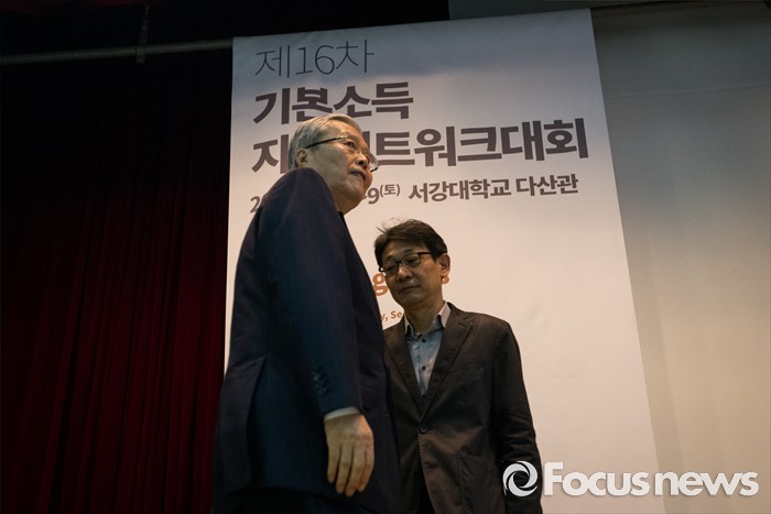 (서울=포커스뉴스) 김종인 더불어민주당 비상대책위원회 대표가 7일 오전 서울 서강대학교 다산관에서 열린 제 16차 기본소득지구네트워크 대회에서 축사를 하기 위해 발언대에 오르고 있다. 이번 16차 대회는 아시아에서는 처음 열리는 기본소득 국제 대회로 세계 23개국에서 기본소득 운동을 벌이는 활동가와 이론가들이 참석한다.