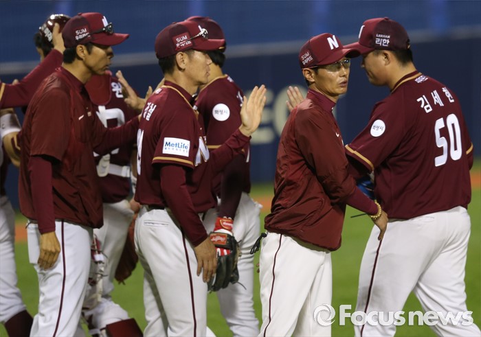 (서울=포커스뉴스) 6일 서울 잠실구장에서 열린 2016 프로야구 넥센-두산 경기에서 두산을 물리치고 6연승한 넥센 염경엽 감독이 선수을을 격려하고 있다.