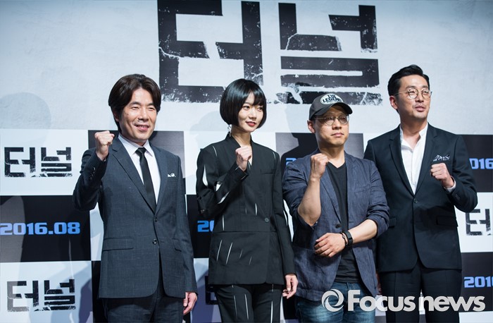 (서울=포커스뉴스) 7일 오전 서울 강남구 압구정 CGV에서 열린 영화 '터널' 제작보고회에 참석한 배우 오달수(왼쪽부터), 배두나, 김성훈 감독, 하정우가 포토타임을 갖고 있다.