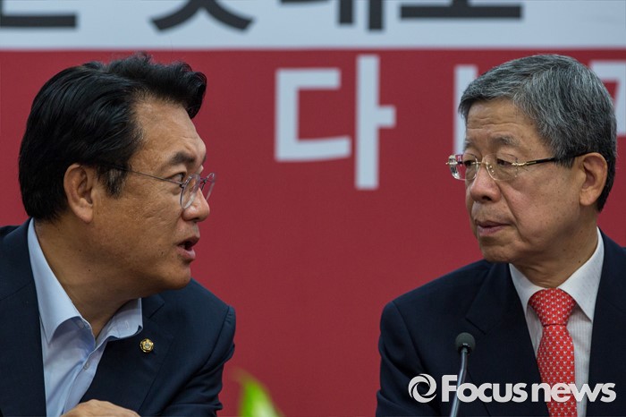 (서울=포커스뉴스) 김희옥(오른쪽) 새누리당 혁신비상대책위원장과 정진석 원내대표가 7일 오전 서울 여의도 새누리당사에서 열린 혁신비상대책위원회의에 참석해 대화 하고 있다.