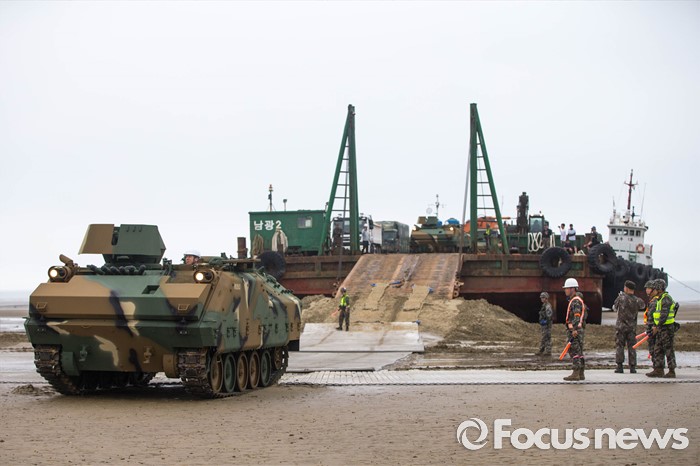 (태안=포커스뉴스) 7일 오전 충청남도 태안군 안면읍 인근 해안에서 2016 합동 해안양륙군수지원(J LOTS) 훈련이 열리고 있다. 합동참모본부 주관으로 해군과 해병대, 육군, 해경이 참가하는 합동 해안양륙군수지원 훈련은 항만 사용이 불가한 지역에서 작전을 수행중인 전투부대에 군수지운을 하기 위한 작전이다.