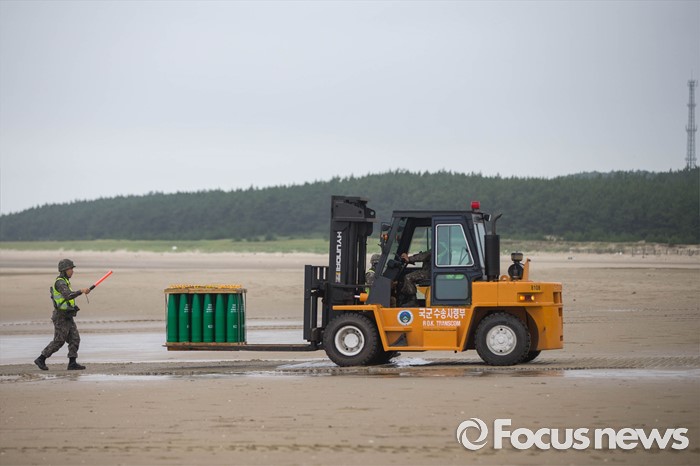 (태안=포커스뉴스) 7일 오전 충청남도 태안군 안면읍 인근 해안에서 2016 합동 해안양륙군수지원(J LOTS) 훈련이 열리고 있다. 합동참모본부 주관으로 해군과 해병대, 육군, 해경이 참가하는 합동 해안양륙군수지원 훈련은 항만 사용이 불가한 지역에서 작전을 수행중인 전투부대에 군수지운을 하기 위한 작전이다.