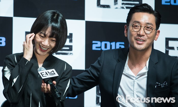(서울=포커스뉴스) 7일 오전 서울 강남구 압구정 CGV에서 열린 영화 '터널' 제작보고회에 참석한 배우 배두나(왼쪽)와 하정우가 미소를 짓고 있다.