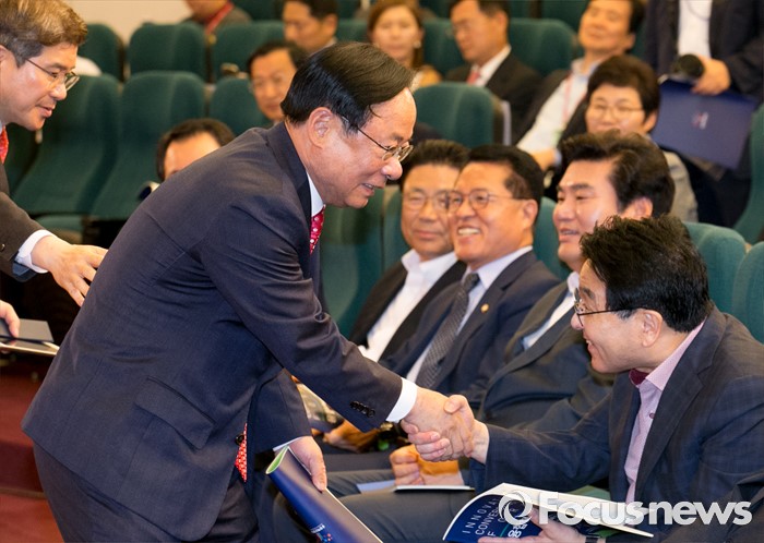 (서울=포커스뉴스) 7일 오전 서울 여의도 국회도서관에서 열린 융합혁신경제포럼 창립총회에 참석한 심재철(오른쪽) 국회 부의장과 이주영 새누리당 의원이 악수하고 있다.