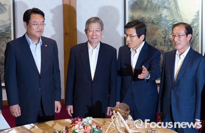 (서울=포커스뉴스) 7일 오후 서울 종로구 삼청동 국무총리공관에서 열린 당·정·청 정책조정협의회에서 참석자들이 기념촬영을 하고 있다. 왼쪽부터 정진석 새누리당 원내대표, 김희옥 혁신비상대책위원장, 황교안 국무총리, 이원종 대통령 비서실장.