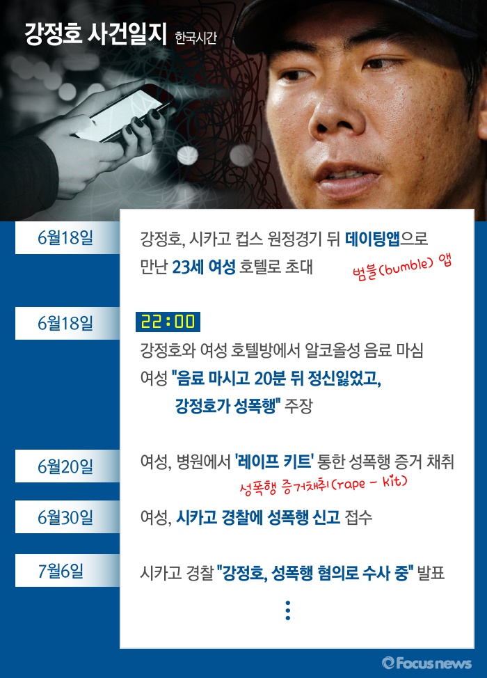 (서울=포커스뉴스) 강정호(피츠버그 파이어리츠)가 성폭행 혐의를 받고 있다. 시카고 경찰은 23세 여성의 신고를 받고 강정호를 성폭행 혐의로 조사하고 있다고 6일 밝혔다. 강정호로서는 선수생활 최악의 상황을 맞았다.