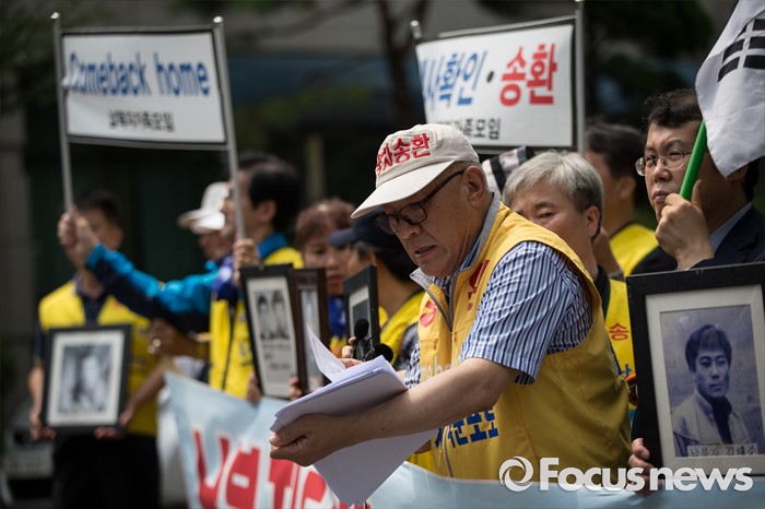 (서울=포커스뉴스) 납북자가족모임과 국군포로가족회 회원들이 7일 오후 서울 서초구 민주사회를위한변호사모임 사무실 앞에서 '납북자들에 대한 인신보호법상 구제 청구' 기자회견을 하고 있다.