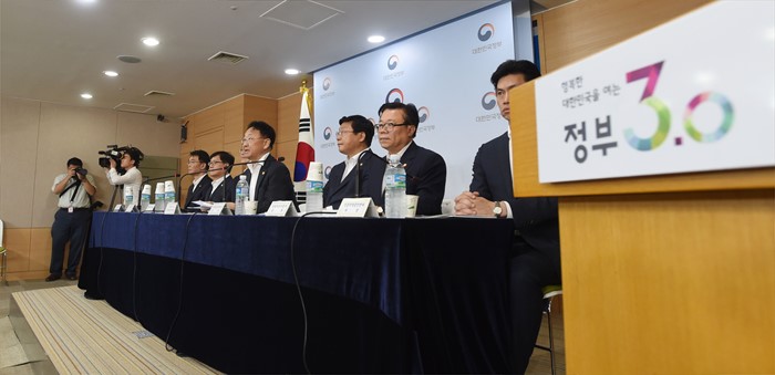 (서울=포커스뉴스) 유일호 부총리 겸 기획재정부 장관이 7일 서울 종로구 정부서울청사에서 '제10차 무역투자진흥회의' 결과 관계부처 합동브리핑에서 모두발언을 하고 있다. 왼쪽부터 강호인 국토부 장관, 정진엽 복지부 장관, 최양희 미래부 장관, 유일호 부총리, 주형환 산업부 장관, 이동필 농식품부 장관, 손문기 식약처장. <사진제공=기획재정부>