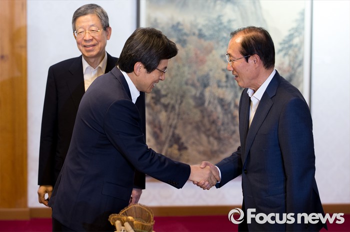 (서울=포커스뉴스) 7일 오후 서울 종로구 삼청동 국무총리공관에서 열린 당·정·청 정책조정협의회에서 황교안 (왼쪽 두번째) 국무총리가 이원종 대통령 비서실장과 인사를 나누고 있다. 왼쪽은 김희옥 새누리당 혁신비상대책위원장.