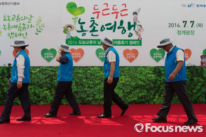 (서울=포커스뉴스) 7일 오후 서울 종로구 청계천 광장에서 열린 '2016 도시 농촌 교류의 날 및 농촌여름휴가 캠페인'에 참석한 내빈들이 퍼포먼스를 끝내고 무대를 내려가고 있다.