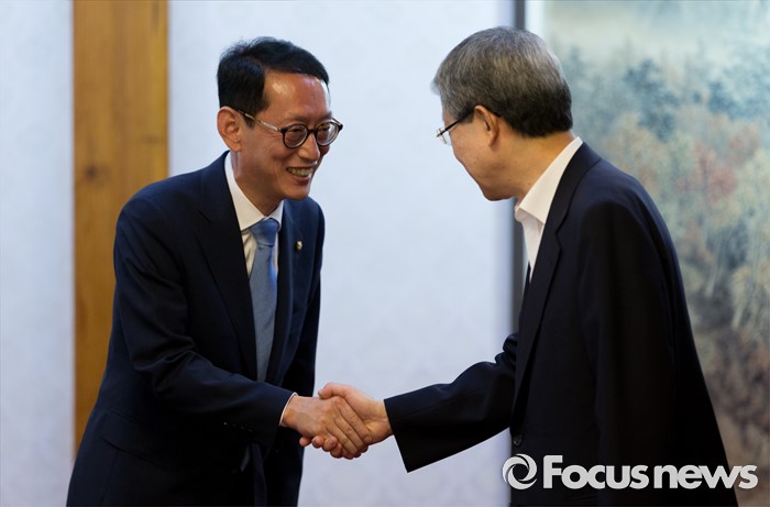 (서울=포커스뉴스) 7일 오후 서울 종로구 삼청동 국무총리공관에서 열린 당·정·청 정책조정협의회에서 김희옥(오른쪽) 새누리당 혁신비상대책위원장이 김도읍 새누리당 원내수석부대표와 인사를 나누고 있다.