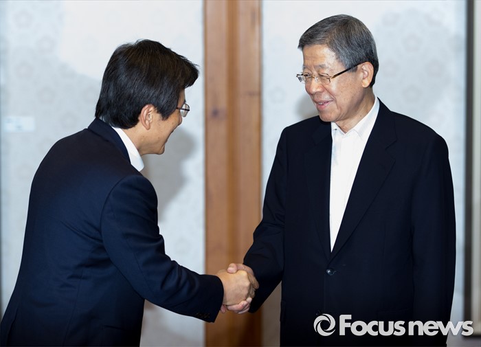 (서울=포커스뉴스) 7일 오후 서울 종로구 삼청동 국무총리공관에서 열린 당·정·청 정책조정협의회에서 황교안(왼쪽) 국무총리가 김희옥 새누리당 혁신비상대책위원장과 악수를 하고 있다.