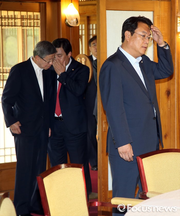 (서울=포커스뉴스) 7일 오후 서울 종로구 삼청동 국무총리공관에서 열린 당·정·청 정책조정협의회에서 정진석 새누리당 원내대표가 회의장으로 드어서고 있다.