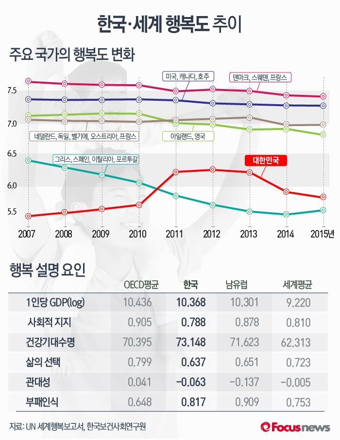 (서울=포커스뉴스) 3월 UN이 발표한 '세계행복보고서 2016'에 따르면 세계 각국의 행복도는 지역에 따라 차이를 보이고 있지만, 대체적으로 경제 발전 수준을 반영하고 있다. 한국의 경우 2011년 이후 행복도가 하락하는 추세이다.