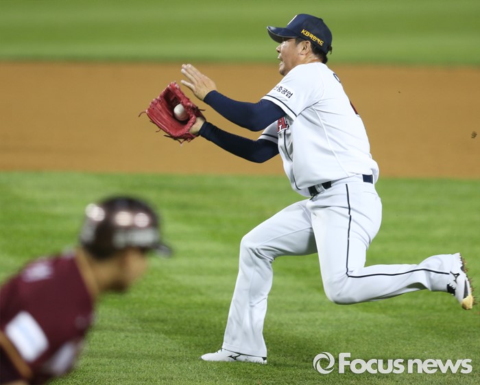 (서울=포커스뉴스) 6일 서울 잠실구장에서 열린 2016 프로야구 넥센-두산 경기 9회초 무사 1루에서 두산 마무리 투수 이현승이 넥센 김민성의 투수앞 땅볼 타구를 잡고 있다.