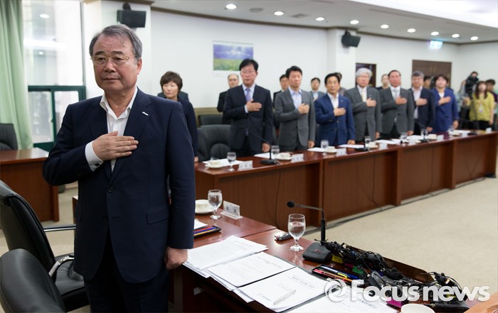 (서울=포커스뉴스) 8일 오전 서울 송파구 올림픽파크텔에서 열린 대한체육회 제4차 긴급 임시 이사회에서 강영중(왼쪽) 대한체육회 회장과 참석자들이 국민의례를 하고 있다. 이번 임시 이사회에서는 박태환의 리우 올림픽 출전 여부가 긴급 안건으로 상정됐다.